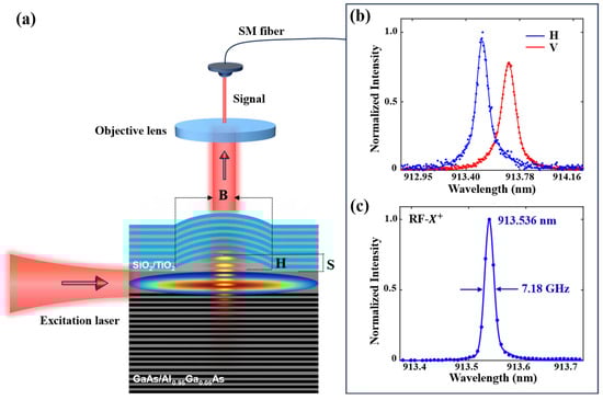 To achieve high-performance single photons, we introduced a single QD deterministically coupled to a Purcell-enhanced defect-type Fabry–Perot (FP) microcavity [25]. This microcavity consisted of 7 pairs of SiO2/TiO2 top distributed Bragg reflectors (DBRs) and 46 pairs of GaAs/Al0.95Ga0.05As bottom DBRs, with low-density InAs/GaAs QDs embedded at the center. A parabolic-shaped lens defect imposed lateral confinement on the emission of QDs, leading to a significant reduction in the mode volume of the optical field. The utilization of dielectric layers as the top DBR allowed us to achieve good curvature, even at thicknesses of a few micrometers. The quasi-Gaussian mode field of the 2λ-GaAs film (the transverse light field in Figure 1a) facilitates low-loss long-distance laser transmission within the sample (λ represents the wavelength of the material), while the design of the top and bottom DBRs facilitated directional emission of single photons (the longitudinal light field in Figure 1a). By employing side excitation, where the pump laser and signal propagation directions were spatially orthogonal, we achieved low-loss resonant fluorescence of the QD. By adjusting the geometrical parameters of the defect cavity, we achieved a maximum Q factor of 15614, with the highest extraction efficiency of the single photon source reaching approximately 94.9% under the conditions of B = 4 µm, S = 480 nm, and H = 350 nm. Further details of the sample can be found in reference [25].