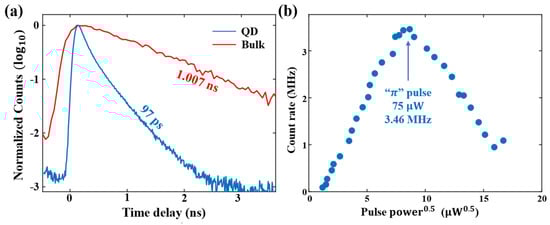 The quantum dot (QD) used in this study is located 500 µm from the cleaved edge of the sample, leading to a longer laser propagation distance within the waveguide. Compared to a QD situated 40 µm from the edge (reference [26]), we required higher pump power to achieve a “π” pulse, which in turn enhanced filtering ability. However, due to the proximity of the QD to the marker, the single-photon purity at saturation was 92.49%, higher than the 90% purity for the QD 40 µm from the edge. Since single-photon purity impacts the Hong–Ou–Mandel (HOM) interference contrast, we conducted phase measurements at half the saturation intensity () to ensure sufficient single-photon purity along with a high single-photon count rate.