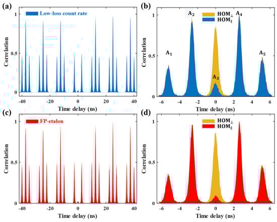 Here, η represents the overlap of the photons at two BSs, which can be determined via classical interference (Figure 5b). Therefore, the increase in the area of the central peak mainly arose from η and . For the low-loss excitation with a of 78.97%, we obtained a value of 59.01% for the contrast of the interference fringes, defined as . After filtering with the etalon, the contrast of the interference fringes increased to 79.79% (Figure 5a).