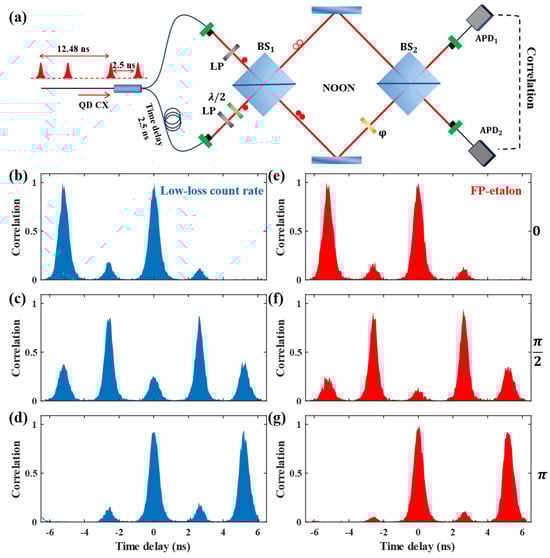 Phase measurement with a NOON state. The second−order autocorrelation function of MZI output: Peak A3 exhibited oscillations with a period of π, while A1 and A5 exhibited oscillations with a period of 2π. (a) Optical setup of phase measurement: Identical photon pairs met at BS1 forming the NOON state, and after passing through the MZI, the relative phase evolution of the two paths of the interferometer could be estimated. The second−order correlation function at the two outputs of BS1 could be used to assess the indistinguishability of single photons. (b–d) Interference patterns for the low−loss condition: For the phase shift of π/2, we obtained a value of 0.1252 for the minimal coincident count , while the maximal coincident count was 0.4857. (e–g) With the FP−etalon, the HOM interference contrast and the indistinguishability of single photons increased (= 0.4894, = 0.0550).