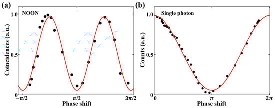 We proceeded to introduce the NOON state into a phase-dependent Mach–Zehnder interferometer (MZI) constructed with two beam splitters, incorporating a phase shifter to induce continuous relative phase variation in two paths (see Figure 4a). When the input was a classical state (such as a coherent state) for phase measurement, the output intensity following the interferometer satisfied the following: