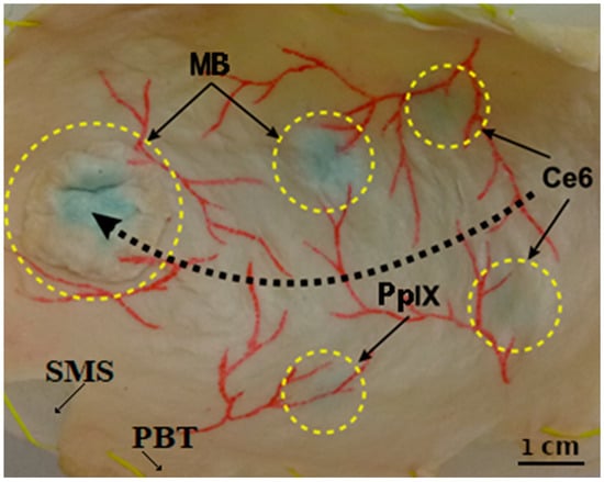 Picture of the bladder phantom showing (i) the silicon molded substrate (SMS) behind (ii) the porcine bladder tissue (PBT) attached to it, (iii) the vascular patterns drawn in red on the bladder wall surface, and (iv) four locations (small, dotted circles) where the three different photosensitizers were injected: Protoporphyrin IX (PpIX), Chlorin e6 (Ce6), and methylene blue (MB). The fifth-bigger dotted circle highlights the separate flap containing MB PS applied to mimic the papillary type of tumors. The black dotted arrow indicates the displacement path of the endoscope tip to acquire images (as mentioned in Section 2.2).