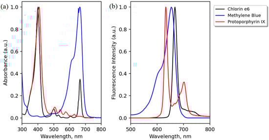 Peak-normalized absorption (a) and emission (b) spectra of the three PS used: Protoporphyrin IX (PpIX), methylene blue (MB), and Chlorin e6. Adapted from the data available at [38,39].