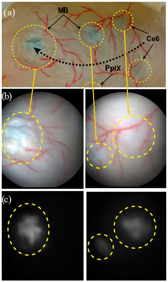 Figure 4. (a) Dotted black arrow showing the displacement trajectory performed by the endoscope tip, and pairs of images recorded on the bladder phantom under (b) white light illumination modality (color images) and (c) fluorescence excitation modality, i.e., gray-level images of MB (left) and Ce6 (right) fluorescence. The yellow dotted circles correspond to the fluorescing areas.