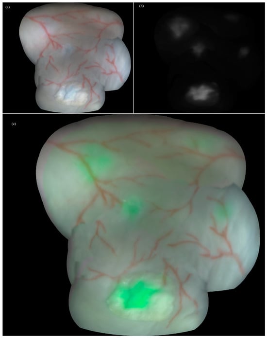 Our so-called “bimodal” model refers to the fact that fluorescing foci mimicking bladder CIS fluorescence can also be imaged (using the fluorescence imaging modality of the bimodal cystoscope). To do so, PSs were directly injected at three different locations under the upper layer of the mucous membrane of the porcine bladder (Figure 1 and Figure 2). In order to perform our experimental validation for different PSs approved for clinical use, each of the three locations was injected with Ce6, MB, and PpIX, respectively. Moreover, a separate flap of a piglet bladder containing MB PS was also applied to mimic the papillary type of tumors (Figure 2).