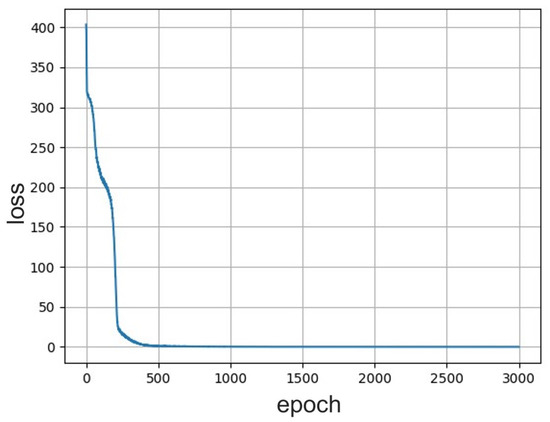 The number of neurons in the output layer of the prediction neural network trained with autoencoder preprocessed data was set to 350, according to the encoding size. The number of neurons in the output layer of the prediction neural network trained with PCA preprocessed data was set to 50, according to the number of principal components. The number of intermediate layers in the prediction neural network trained with autoencoder preprocessed data was fixed to three, and the other one was fixed to one. The neurons number input layer of both predition neural networks was fixed to six, according to number of machine parameters. The loss function trends during training procedures using the Sigularity server computational tool are shown in Figure 5 and Figure 6. The loss functions asymptotically decrease while increasing the number of epochs, and the minimum value is close to 0 on the order of for both networks.