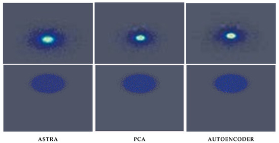 Comparison of two different beam histogram generated with ASTRA simulator (first column) and predicted with the neural network trained on data encoded by the PCA (middle column) and by autoencoder (last column).