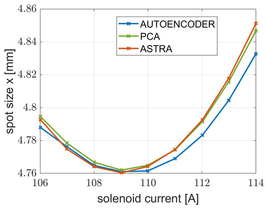 For the emittance measurements, the x spots measured from predicted histrograms on both neural networks were compared with the value obtained from ASTRA simulation. The result is visible in Figure 10.