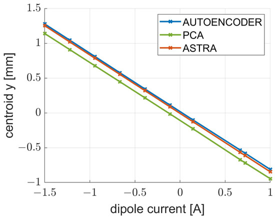 The trends fit well near the minimum beam waist (109 A), which is a point of interest in the optimal working point research. Furthermore, the differences between the predicted and simulated measures is on the order of mm, which is a value below the resolution of the SPARC camera (14 μm) and therefore not perceptible. For the energy measurements, the centroids y measured from the predicted histrograms on both neural networks were compared with the value obtained from ASTRA simulation. The result is visible in Figure 11.