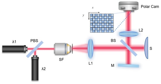 The operational principle of single-shot dual-wavelength interferometry, employing a polarization camera, is shown in Figure 1. In this set up, laser beams at and are polarized along the x-axis and y-axis, respectively, and subsequently combined via a polarized beam splitter (PBS). The merged laser beam undergoes expansion and collimation before entering the interferometer equipped with a spatial filter (SF) and collimating lens (L1). Within the interferometer, the incident laser beam splits into two paths: one illuminates the sample (S), while the other reflects off a slightly tilted reference mirror (M). The resulting reflected light beams from both the object and the reference mirror interfere with the sensitive chip of a polarization CCD camera. The inset illustrates the structure of the CCD’s sensitive chip, where pixels containing horizontal and vertical patterns record light polarized along the x and y directions, respectively. Additionally, pixels filled with patterns oriented from up–left to down–right detect light polarized at an angle of −45° relative to the y-axis, while those with patterns from up–right to down–left receive light polarized at an angle of +45° relative to the y-axis. The CCD camera is positioned on the common imaging plane of both mirror M and sample S. By detecting light polarized in four different directions using corresponding pixels of the polarized camera, the experimental setup depicted in Figure 1 is significantly simpler and more compact compared to a previously reported approach [29] that employs a pixel multiplexing scheme.