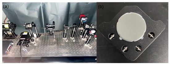 The specimen utilized in these experiments, depicted in Figure 2b, consisted of a round painted plastic sheet affixed to a lens holder along its side. Positioned at the center of the lens holder was a spiral micrometer, enabling the alteration of the plastic sheet’s shape by introducing various deformations. Precise adjustments to the spiral micrometer allowed for accurate manipulation of the thin sheet’s deformation, with the maximum deformation directly determinable by reading the measuring scale on the micrometer.