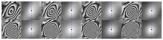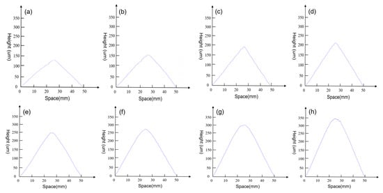 Following Equation (10), the speckle noise apparent in Figure 5c arises from the first term of Equation (10) and can be effectively mitigated by Fourier transformation applied to these fringes, selectively retaining low-spatial components. Figure 5d illustrates the resulting interference fringes after noise removal, showcasing a smooth pattern. The subsequent Fourier transformation of Figure 5d yields its spectrum in Figure 5e. Employing the spatial filtering method to isolate the +1 order spatial components from Figure 5e, relocating them to the center of the computational matrix, and executing an inverse Fourier transform generates the phase diagram of the wrapped surface contour, as depicted in Figure 5f. Figure 5g represents the true phase diagram of Figure 5f, following the unwrapping process, while Figure 5h provides a vertical line graph corresponding to the true phase map. Since the obtained interference fringe pattern in Figure 5d exhibited clarity, the least-squares-algorithm-based phase unwrapping method was applied to compute unwrapped phase maps in Figure 6, prioritizing both high computing speed and accuracy [30]. Spatial filtering and phase computation in Figure 5f could be accomplished with a single Fourier transform, eliminating the necessity of generating the fringes in Figure 5d. The inclusion of the clear interference fringes in Figure 5d serves solely to validate the theoretical analysis presented in Section 3.