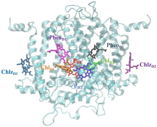 Photosynthesis is one of the most important light-driven biological processes, which converts light energy into chemical energy through a series of photochemical events. Photon energy absorbed by the light-harvesting antennas is funneled to the PSII reaction center (RC). The PSII RC plays a vital role of utilizing the absorbed photons for efficient separation of electronic charges, which eventually leads to water dissociation and oxygen generation. PSII RC is a multi subunit protein complex, which is embedded in the photosynthetic system and it is structure has been well resolved by X-ray crystallography [,,]. It contains eight cofactors, symmetrically located along the protein central axis. It contains two primary chlorophylls, and ; two accessory chlorophylls, and ; two pheophytins, and ; and two peripheral chlorophylls, and , respectively. Recent studies have implied that only the branch is active in the charge separation process in the reaction center, while the branch shows the capacity for the flowing of extra energy generated by strong light excitation []. A detailed protein structure and the pigment locations are shown here in Figure 1.