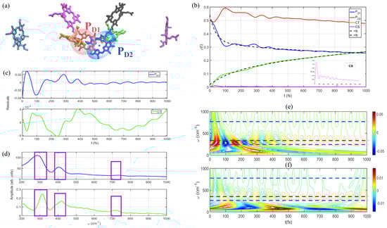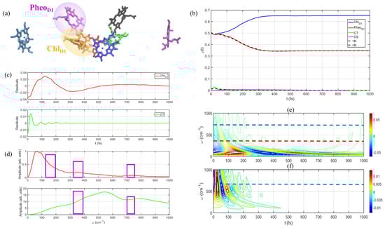 (a) The arrangement of pigments ( and ). (b) The population dynamics of the radical pair ( and ), charge transfer (CT) and charge separation (CS) states calculated at 77 K. Time-resolved residuals and FFT results are shown in (c,d). The peaks are marked as magenta boxes in (d). The wavelet analysis of residuals ( and CT) are shown in (e,f), respectively.