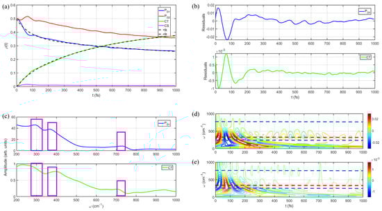 (a) Population dynamics of , , CT and CS states at 300 K. Residuals and FFT results are plotted in (b,c), respectively. (d,e) show the results of wavelet analysis of and CT.