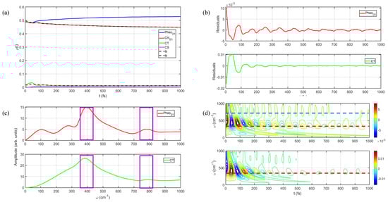 (a) The population dynamics of , , CT and CS states. The residuals and FFT results are shown in (b,c), respectively. The wavelet analysis of and are plotted in (d).