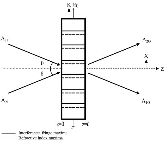 In Equations (1) and (2), the term ‘’ corresponds to the coupling constant, which is defined as ‘’, where ‘n’ is the background refractive index of the crystal. We assume there are linearly polarized beams (here, we consider the two writing beams to be ideal plane waves; this means that their intensity is perfectly uniform across the wavefront) intersecting at an angle of 10 degrees with respect to the z-axis, where ‘w’ is the frequency of the input light field, ‘r’ is the electro-optic coefficient, and ‘c’ is the velocity of light. Here, the electro-optic co-efficient defines the direction of polarization of the light beam with respect to the orientation of the, crystal which is a tensor. In this paper, we use the effective electro-optic co-efficient from [], which is assumed to be a scalar and independent of the polarization of light. In Equation (3), the terms ‘Q’ and ‘’ correspond to the complex amplitude of the index grating and the magnitude of the applied AC field, respectively. ‘, , & ’ represent the material fields in the crystal and are defined as follows: ‘’ is the diffusion field, defined as ‘’; ‘’ is the electric field that moves an electron a distance of ‘’ during its lifetime, defined as ‘’; and ‘’ is the saturation value of the space-charge field, defined as ‘’. The above-mentioned parameters that correspond to the LiNbO3 crystal can be found in []. The photovoltaic effect is a characteristic property of a lithium niobate crystal, which is represented by the bulk photovoltaic term . This bulk photovoltaic term is not included in Equation (3), which corresponds to the case where it can be neglected, as reported earlier [,]. But the term cannot be neglected otherwise, and the equation that includes the ‘’ term is shown in Equation (4). Here, ‘, where ‘’ is the photovoltaic length. In this research, we will consider both the cases (with and without the photovoltaic term) in the simulation and discuss its effects.