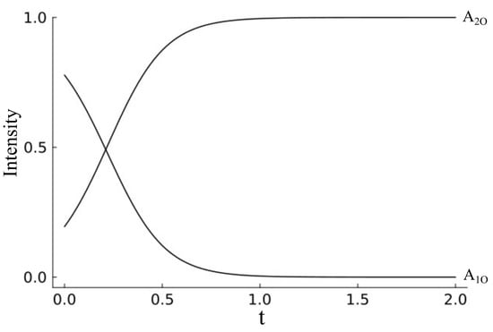 The incident light beams result in a space-charge field being developed in the crystal. The temporal evolution of the space-charge field or index grating in the material for a given light intensity distribution is described by the Kukhtarev’s time-dependent equation, Equation (3) [,]. The temporally varying complex amplitude of the grating results in a temporally varying light intensity at the exit of the crystal. This temporal variation in the exiting (output) light signal is the pivotal factor in the generation of complex signals. Solutions to the three coupled differential equations (Equations (1)–(3)) will help us understand the characteristics of temporal variation in the intensity of the output beam.