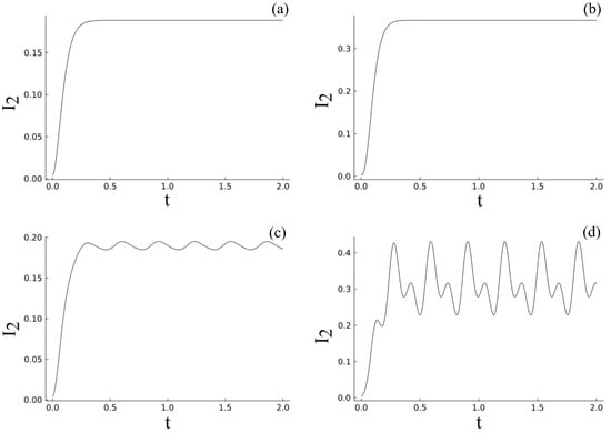 Since we are interested in understanding the emergence of new periodic patterns, we plot the variation of the signal beam () with respect to time for different magnitudes of the applied field, as shown in Figure 5. An increase in the applied field increases the absolute amplitude of the output signal (higher gain). But here, we are are interested in the new-born patterns and their frequencies and not on the absolute value of intensity. Hence, we normalize the intensity of the signal beam in the plots, which makes the qualitative comparison of the different pattern generated easy. For normalization, we consider the abscissa to start from 0.5 units of time to 2.0 units of time. Upon increasing the amplitude of the sinusoidal electric field (keeping the frequency fixed), we can see the emergence of new peaks with new frequencies, as shown in Figure 5b–i. The emergence of the new peaks can be attributed to the coupled sequence of events (from carrier generation to refractive index modulation to light diffraction) happening in space and time, which generates a nonlinear dynamic optical response. This response can be visualized as amplitude modulations in the exiting light beams. But this dynamic response can quickly converge to a saturation. Here, since we perturb the system, (using a sinusoidal electric field) the generated nonlinear dynamic signals persist forever. Hence, we observe a continuous generation of new frequency components in the output signal. When the applied electric field is increased further, then the intensity of the output signal shows more closely packed peaks with no clear periodicity.