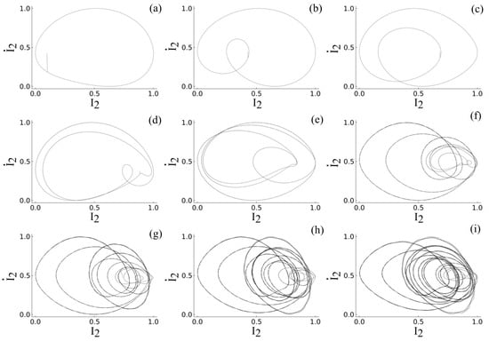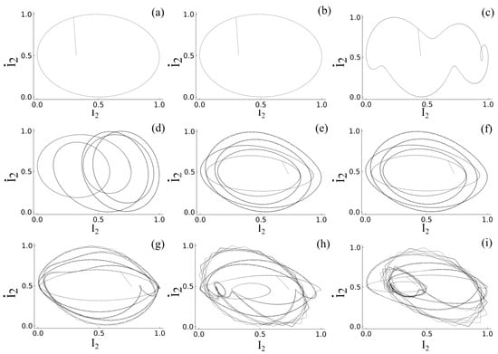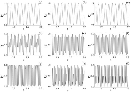 We now examine the case where the photovoltaic effect is not neglected. For this, we re-run the simulation but use Equation (4) this time, where the value of used is shown in Table 1. Here, the applied fields were set from 0.1 KV/cm to 14 KV/cm since a chaotic response was observed for higher applied fields. The change in intensity of the light signal with time is plotted in Figure 6a–i. From the plots, a similar behavior (to the neglected case) can be observed, where the complexity in the nonlinear dynamic signals increases with the applied field amplitude. But it is interesting to note that it does not follow the same frequency pattern and exhibits a more complex period-doubling route here. From this, we can conclude that the PR-TWM shows period-doubling behavior for both cases but with different frequency patterns.