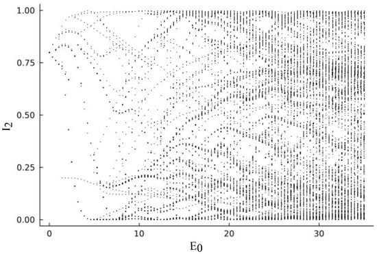 The case where the photovoltaic effect is neglected shows a clear period-doubling route to chaos. But, with photovoltaic effects included, the system shows more complex period-doubling behavior, which demands more careful analysis to completely understand its route to chaos. So, for further analysis, here, we consider only the case without a photovoltaic effect. A visual summary of period-doubling characteristics can be obtained using a bifurcation diagram. Figure 9 depicts the numerically obtained bifurcation diagram for the intensity of the output signal () for varying applied electric field amplitudes ranging from 0 KV/cm to 30 KV/cm. We can observe that the branching starts even from small values of amplitude of the electric field () as small as 2 KV/cm. Multiple branches start to originate as we increase the magnitude of as new periods are generated, which is directly observable from the bifurcation plot. This bifurcation diagram is unique and is distinct from other bifurcation patterns commonly observed in nonlinear dynamical systems (the bifurcation diagram reported here is different from the ones from popular nonlinear dynamic systems, such as Lorentz, Logistic Map, Rössler system).