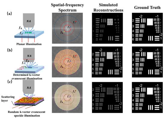 Two mainstream methods have been proposed to achieve this modulation. One method is to continuously generate an evanescent illumination field with determined k-vectors with designed magnitude and directions to obtain a series of resolution limited SFS images. Using demodulated high-frequency information of the sample from these SFS images using proper algorithms, we can realize SR imaging, as shown in Figure 1b. This method is similar to Fourier Ptychographic microscopy (FPM) [] and classical SIM, but the k-vector of evanescent illumination can be much larger. FPM and SIM can only modulate high spatial frequency that can originally be transmitted in the detection medium, resulting in limited resolution improvement; while using evanescent illumination, larger spatial frequency that should be bounded in the near-field can be transferred to the low-passband filter of the objective lens, exceeding twice the resolution limit, as shown in Figure 1b. However, there are conditions in which controlling the k-vector of the evanescent illumination precisely will be too difficult due to process limitations, unavoidable speckle, dispersion, and so on. In this condition, another method is to generate a large number of random k-vector evanescent speckle illuminations by a scattering layer and high refractive medium to restore the whole high-frequency information of the sample, as shown in Figure 1c. Typically, there are two strategies that make use of the evanescent speckle illumination. One is to generate a series of uncorrelated evanescent speckle illuminations; their average should be roughly homogeneous, which is known as blind-SIM []. The other is to utilize the optical memory effect within small angles [] and scan the samples with a determined evanescent speckle illumination. Then, the high spatial frequency is modulated randomly by the evanescent speckle illumination and reconstructed by an iterative algorithm.