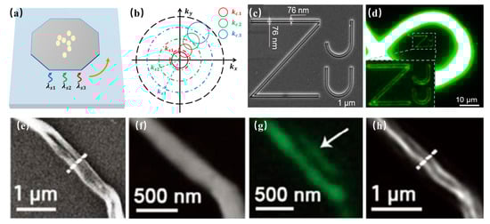 However, it should be noted that although NWRIM can resolve some subwavelength label-free features, the SFS images cannot represent the true spatial size and location of the samples. The reason is that if the shift k-vector of EW illumination is larger than the cut-off vector , which is determined by the NA and work wavelength , the SFS images of continuous samples will swell and distort because of the frequency gap between the shifted high spatial-frequency and low-frequency passband of objective lens. To solve this problem, Pang et al. [] utilized fluorescent polymer films as light source to modulate the k-vector of EW illumination and collected complete spatial-frequency of samples. The direction of EW illumination is tuned by locally exciting the fluorescent polymer films around the polygonal planar waveguide, as shown in Figure 3a. The precise control of the k-vector magnitude of the EW illumination is realized by wavelength control and oblique illumination to realize the wide-band acquisition of high spatial-frequency information, as shown in Figure 3b. The black, red, green, and blue solid line circle refer to the high spatial-frequency spectrum of SFS images shifted by oblique illumination and EW illumination , , and . Using a Gerchberg–Saxton (GS) iterative algorithm [], a 128 nm label-free SR image is reconstructed from the SFS images above. Compared with the direct SFS image in Figure 3g, the SR image reconstructed from the modulated SFS images is much more consistent with the SEM image, which ensures the practical applications in material science and life science. Later, the same group further theoretically and experimentally demonstrated the applicability of the high refractive index waveguide platform for label-free SR microscopy imaging by wavelength control, which can significantly reduce the complexity of optical set-up in super-resolution system by simplify the excitation light method [,].