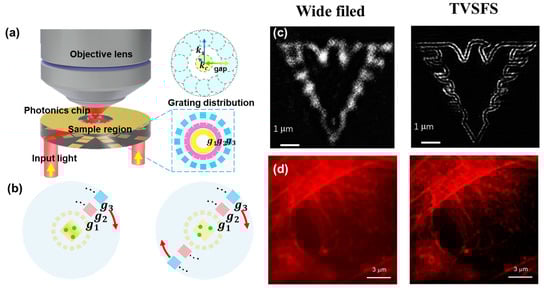 Later in 2022, Tang et al. [] proposed and experimentally demonstrated tunable virtual-wavevector spatial-frequency-shift (TVSFS) for both label-free imaging and fluorescent label imaging by tuned grating design. Diffractive gratings are fabricated on the GaP chip’s surface to provide EW illumination with determined k-vector on the other side of the chip, as shown in Figure 5a,b. By applying different illumination strategies, a tunable deep spatial-frequency-shift SR microscopy imaging can be realized, which is compatible with both label-free and fluorescent labeled samples. A large field of view and resolution improvements of 4.5 times for label-free imaging (120 nm) and 3.2 times for fluorescent labeled imaging (93 nm) on complex samples are demonstrated in this work, as shown in Figure 5c,d. Further resolution enhancement depends on the increase of the effective index of the waveguide. With its compatibility and monolithic integration, the TVSFS method can serve as a multifunctional platform on which many functions (e.g., electrical stimulation, microfluidics, and sensing) can be integrated for application in fields such as biology, materials science, and chemical research.