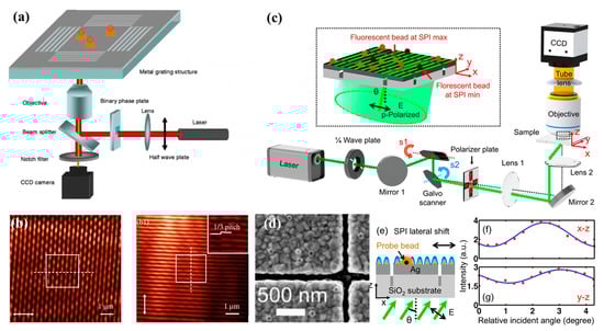 In the same year, Yuan et al. [] demonstrated a high-resolution wide-field fluorescence microscopy by using standing surface plasmon waves induced by optical vortices (OVs). Later in 2012, Yuan et al. [] improved their experimental setup using subwavelength slit arrays embedded in a thin silver film to generate surface plasmon standing wave interference patterns, as shown in Figure 6a. By controlling the phase and polarization of the incident light, the interference pattern is shifted, and the direction is changed (Figure 6b). As a result, a resolution of 172 nm for fluorescent samples is achieved by PSIM at a wavelength center of 645 nm using a 1.42-NA objective lens. In 2014, Liu et al. [] demonstrated an edge excitation method for PSIM. A groove structure with a period of 7.6 μm is etched on a single-layer silver film with a thickness of 250 nm to excite surface plasmon polaritons that propagate relative to each other, as shown in Figure 6c,d. By controlling the incident angle and polarization of the incident light, the interference pattern is shifted and the direction is changed, as shown in Figure 6e–g. In this method, the full width at half height of fluorescent molecule is decreased from 327 nm to 123 nm, achieving a 2.6 times resolution improvement.
