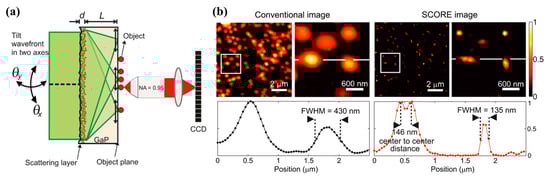 The new fluorescence imaging method proposed by Hasan Yilmaz et al. [] in 2015 is classic waveguide based super-resolution microscopy, which enhances the spatial resolution by speckle correlation. This method is named speckle correlation resolution enhancement (SCORE) microscopy. A beam of coherent light illuminates a scattering layer on a GaP substrate and generates a speckle pattern illumination with a large k-vector in the other side. By utilizing the invariance of speckle patterns at small angles, the sample is scanned by changing the angle of incident light and 2500 LR speckle images are captured. Compared with determined k-vector EW illumination, single speckle illumination pattern contains k-vector from 0 to the highest . By demodulating high spatial-frequency information from these LR images, the SR image obtained by SCORE with a spatial resolution of 146 nm is shown in Figure 8b. Although successful, further resolution enhancement is still constrained by the effective refractive index of the illumination substrate similar as the methods described in Section 3.1.