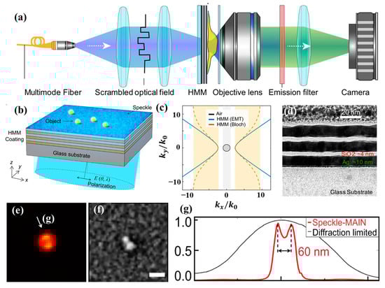In 2021, Liu et al. [] further adopted a hyperbolic meta-surface to generate LP random speckle illumination with larger k-vector to improve the resolution of wide field fluorescence super-resolution, which is named as speckle metamaterial-assisted illumination nanoscopy (speckle-MAIN), as shown in Figure 9a,b. HMM is composed of multiple layers of periodic metallic and non-metallic thin films, which was originally conceived by B. Wood and B. Pendry et al. [] in 2006. The effective refractive index of HMM is largely dependent on the thickness of each film, with a thinner film leading to a higher effective refractive index. Liu et al. processed the hyperbolic meta-surface film composed of 10 nm Ag and 4 nm films using magnetron sputtering method, enabling it to support evanescent illumination with k-vector greater than and achieving a resolution of 60 nm, as shown in Figure 9c–g. Subsequently, Liu’s group further optimized the processing of the HMM and fabricated a single-layer 2.5 nm thick Ag and MgO ultra-thin hyperbolic meta-surface, which further pushed the resolution down to 24 nm [,].