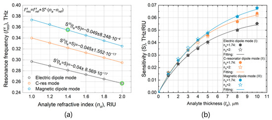 To check the above equations, we calculated the spectra of the metamaterial covered with an analyte of different thicknesses and refractive indices. In each spectrum, we tracked the change in the resonance frequency and then calculated the resonance shift induced by the change in either the refractive index or thickness. The calculated points were fitted by Equations (3) and (10), as shown in Figure 3.