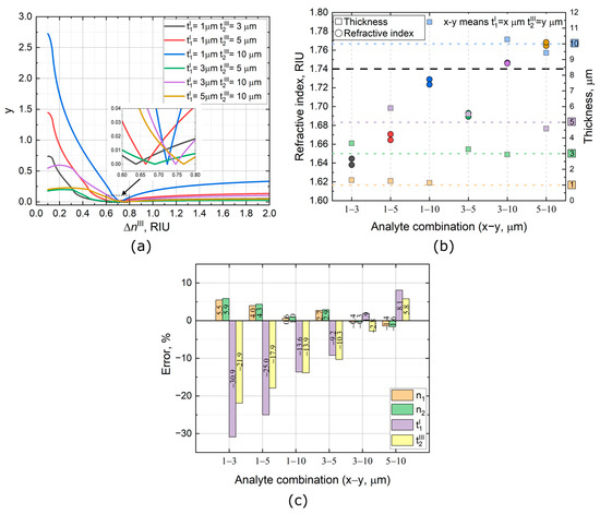 Following our approach, we tried to find the parameters of the analyte with and precalculated values of thickness by using only the sensitivities from Table 1. Figure 4a shows the typical behavior of Equation (20) for various analyte thicknesses, whereas Figure 4b presents the thickness and refractive index values obtained by taking into account the error of the approximation model. According to Figure 4c, the error decreases with increasing thickness contrast and becomes minimal when the thickness is sufficiently far from the saturation mode and the linear operation mode of the sensor ().