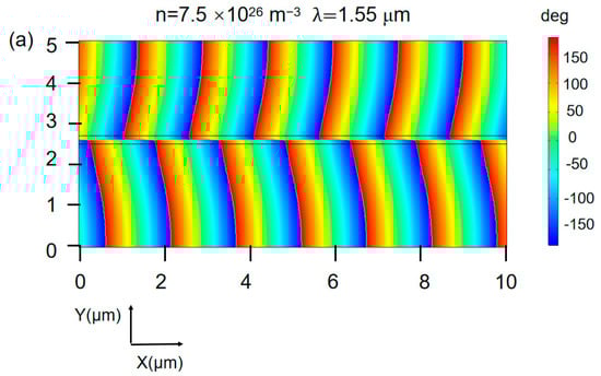 Figure 8 illustrates the x component of the phase distribution when the electron concentrations of ITO are 7.5 × 1026 m−3, 8.5 × 1026 m−3 and 9.5 × 1026 m−3, respectively. It is distinctly observable that the phase exhibits varied distributions at different electron concentrations, thereby confirming that our proposed structure can also control the phase of SPPs dynamically. The reason why the phase can be modulated is that the modulation in electron concentration leads to a change in the refractive index of ITO, and the phase of propagating SPPs is strongly associated with the refractive index of ITO as the optical path is changed.