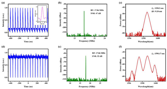In the homemade ring-cavity fiber laser, a self-starting mode-locked state was easily achieved by adjusting the pump power, and the mode-locked threshold pump power was 165 mW. Figure 2a shows the bright mode-locked pulse sequence with a pulse spacing of 56 ns, corresponding to a repetition rate of 17.86 MHz and a cavity length of 11 m, thus indicating that the laser operates in a CW mode-locked state. The inset shows the unfolding of a mode-locked pulse train with a pulse width of about 120 ps. The pulse width, limited by the rise/fall time of photodetector, could not be accurately measured. RF spectrum is a key parameter that can confirm and characterize the stability of the pulse operation. Figure 2b shows the RF spectrum trace of the bright pulse; evidently, the signal-to-noise ratio (SNR) was 47 dB, thus indicating the relative stability of the mode-locked operation. The output spectrum is shown in Figure 2c, with a central wavelength of 1598.5 nm, and the 3-dB bandwidth is 0.24 nm. When the pump power continued to increase and the polarization controller was adjusted, a dark pulse appeared. Figure 2d shows the dark pulse sequence at a pump power of 550 mW, with a pulse interval of 56 ns, corresponding to a repetition rate of 17.86 MHz, the same as that of bright pulses. The SNR and repetition rate of the dark pulses were 52 dB and 17.86 MHz, respectively, as shown in Figure 2e. Notably, the SNR of the dark pulse was slightly higher than that of the bright pulse, which is consistent with the more stable transmission characteristics of the dark pulses in the laser. The corresponding spectrum is shown in Figure 2f, which exhibits a multipeak distribution within a certain range, a typical feature of DW-type dark pulses, where pulses of multiple wavelengths oscillate simultaneously in the cavity, thereby causing temporal topological defects [29]. Furthermore, to confirm that the mode-locked pulse is caused by the THDF-SA, extensive adjustments of the polarization state and pump power were performed in a cavity without the DFSA. No mode-locked pulse was observed, excluding the possibility of self-mode-locked and NPR mode-locked pulses.