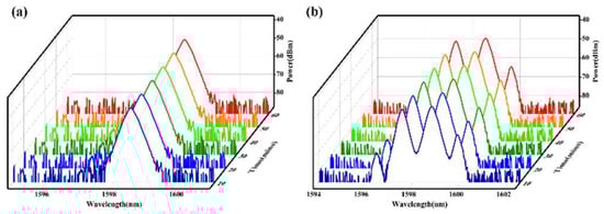 To further evaluate the stability of the bright pulse and dark pulse laser output, the lasing spectrum was scanned at 10-min intervals over a one-hour period, as depicted in Figure 3a,b. These results indicate that the mode-locked lasing output exhibited a high level of stability.