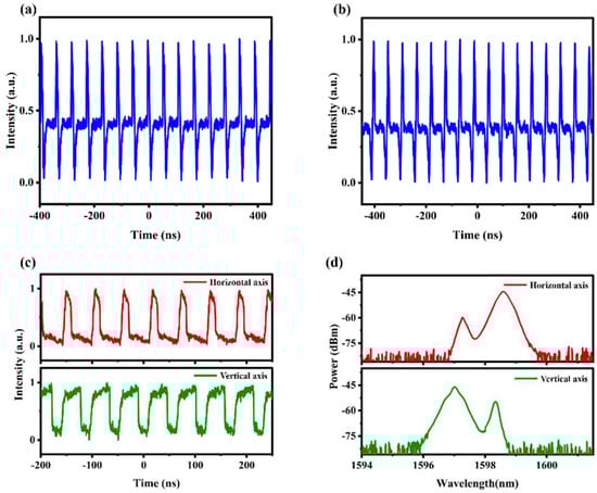 After careful adjustment of the polarization state inside the cavity, bright–dark pulse pairs and dark–bright pulse pairs were obtained, as shown in Figure 4a,b, with a pulse interval of 56 ns corresponding to a fundamental repetition rate of 17.86 MHz. This indicates that the obtained bright–dark and dark–bright pulse pairs were operating in the mode-locked state. In 1989, Afanasyeve [30] et al. demonstrated that strong repulsive interactions may exist between dark and bright pulses and proposed that cross-phase modulation has an important influence on the formation and interaction of pulses. Meanwhile, the bright and dark pulses were predicted to coexist. Research has shown that the generation of dark–bright pulse pairs is caused by cross-phase modulation and polarization effects inside the cavity. To investigate the polarization characteristics of the dark–bright pulse pairs, herein, a PBS was externally connected after OC1 to separate the pulse pairs sequence into two polarization directions [31]. In the experiment, two output pulses in perpendicular polarization directions were successfully detected on the oscilloscope, as shown in Figure 4c, thus proving that the bright and dark pulses exist in two different polarization directions and are orthogonal to each other. Figure 4d shows the corresponding spectrum, with the peak center wavelengths of the strong peaks being 1597.02 nm and 1598.6 nm, respectively. Evidently, the two spectra exhibited distinct differences in wavelength and distribution, thus indicating that the two polarization components are noncoherently coupled. As our filter was unsuitable, we could not filter accurately on the wavelength; however, based on the change in spectral intensity, we can speculate that the long and short wavelengths correspond to the bright and dark pulses, respectively. Additionally, DW-type dark pulses are formed by the oscillation of two or more wavelengths of pulses within the cavity, typically characterized by a spectrum with multiple peaks. Due to the gain competition effect among pulses of different wavelengths and intensities oscillating simultaneously within the cavity, the fiber laser ultimately operates in a dual-wavelength vector mode-locked state.