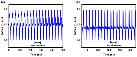 Subsequently, appropriate polarization modulation and gain modulation were performed, and some phenomena were observed in the experiment at a pump power of 550 mW. Figure 5a,b shows a sequence of second-order harmonic bright–dark pulse pairs and second-order harmonic dark–bright pulse pairs, where two pulses can be observed simultaneously within the 56 ns round-trip time of the cavity. The corresponding repetition rate at this time is 35.71 MHz. In this process, the formation of harmonic pulses was due to the increase in pump power and the inherent instability pulse caused by cross-phase modulation splitting. The new pulses slowly moved toward the other pulses in the cavity, eventually forming a harmonic.