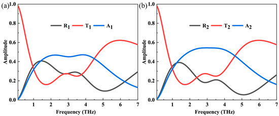Here, we initially investigate single illumination on the proposed asymmetric metasurface. The spectral responses, including reflection, transmission, and absorption, under normal incidence for both front and back illuminations are depicted in Figure 2a and Figure 2b, respectively. The Fermi level of graphene EF is 0.8 eV. It is clear that the transmission from both sides is identical because reciprocity is not broken with this designed configuration. However, reflection and absorption are different due to the structural asymmetry. As illustrated in Figure 2a,b, at a frequency of 2.5 THz, the absorption coefficient for the front illumination is A1 = 45.2%. For the back illumination, the absorption coefficient is A2 = 52.4%. At a frequency of 3.7 THz, the absorption coefficients for the front and back illuminations are A1 = 44.1% and A2 = 55.5%, respectively. We find that the 50% absorption bound is broken for the back illumination due to the proposed extremely asymmetric structural design. Furthermore, across a broad frequency range, the absorption for a single incident wave from either direction approaches 50%, which lays an important groundwork for realizing the broadband CPA response.