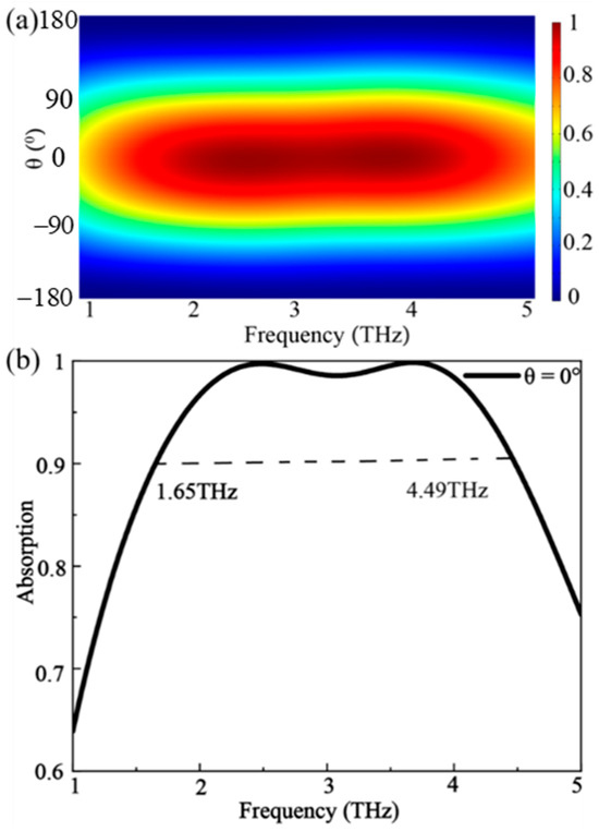 Next, two counter-propagating TM-polarized incident waves illuminate the proposed design normally from the front and back sides simultaneously. Controlling phase difference is very important in achieving the CPA effect; since identical-amplitude coherent illumination was utilized in this work. By varying the phase difference θ between the two incident waves, we aimed to satisfy the CPA condition [34] and achieve perfect absorption. Figure 3a illustrates the calculated absorption coefficient [26] as a function of the operating frequency and phase difference θ between the two input waves. It can be found that over a wide range of frequencies, nearly perfect absorption is obtained when the phase difference θ is smaller than 30°. Importantly, by tuning the phase difference between the incident waves, the absorption coefficients can be modulated from 0 to 99.7% at 2.5 THz and to 99.8% at 3.7 THz. This implies that a coherent beam traversing the CPA structure can be modulated from near-complete absorption to near-complete transparency. The modulation depth (MD) [4,30,43] is a convenient figure of merit for evaluating the performance of the proposed structure for use in devices such as modulators, switches, or detectors. It can be calculated as MD = (Amax − Amin)/Amax, where Amax and Amin are the maximum and minimum of absorption from phase modulation or Fermi level modulation. Here, the MD can reach as high as 0.997 at both 2.5 THz and 3.7 THz through phase modulation. These findings could enable a host of potential applications, including planar terahertz modulators and graphene-based coherent photodetectors [44]. To effectively illustrate the excellent absorption capability of our design, we have set the phase difference constant to compute the relevant output coefficient across various frequencies. Here, we select a specific angle, θ = 0°, as it aligns with the best absorption performance, marked by the destructive interference of the two incoming waves. The outcomes are graphically represented in Figure 3b, showcasing a distinct broadband CPA response with an impressive ≥90% absorption coefficient spanning a broad frequency spectrum from 1.65 THz to 4.49 THz. Note that the same broadband CPA response can be achieved with this structure under TE-polarized incidence, since the structure is symmetric along the x-axis and y-axis.