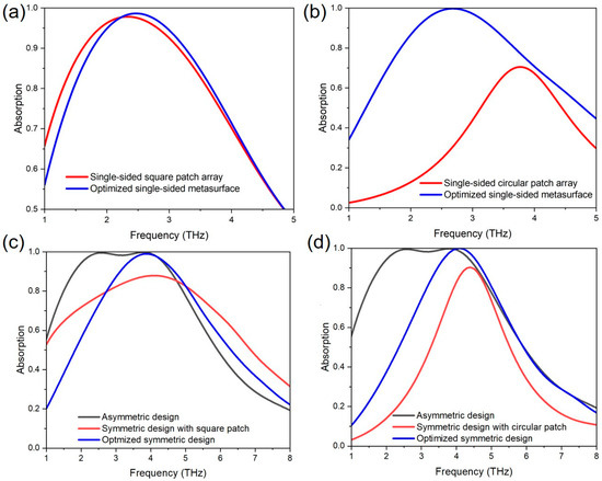 (a,b) The computed coherent absorption coefficients of the graphene metasurface design with (a) a square graphene patch array only on the front side of the silicon substrate and (b) a circular graphene patch array only on the back side of the silicon substrate as a function of operating frequency. The blue line presents the optimized results for the corresponding structural design. (c,d) The computed absorption coefficients of the symmetric graphene metasurface design with (c) an identical square graphene patch array on both sides of the silicon substrate and (d) an identical circular graphene patch array on both sides of the silicon substrate as a function of operating frequency. The black line in (c,d) depicts the absorption coefficient of the asymmetric graphene metasurface design.
