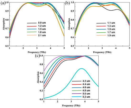 Here, we investigate the impact of different geometric parameters on the absorptivity of the asymmetric graphene metasurface. It is imperative to examine the effects of the silicon thickness t, the radius r of the circular patches, and the length l of the square patches on absorption characteristics. The corresponding simulated results are depicted in Figure 5a–c. Figure 5a illustrates the absorption spectra generated by varying the silicon thickness with the parameters held constant at r = 1.5 um and l = 5 um. As the silicon thickness increases, the first resonance at the lower frequency remains virtually unchanged, yet there is a slight decrease in absorption amplitude. Conversely, the second resonance at the higher frequency exhibits a blueshift, accompanied by a significant decrease in the absorption coefficient. Optimal absorption bandwidth is attained at a silicon thickness of 1.5 um. Subsequently, the absorption at both resonances initially increases and subsequently decreases as we adjust the radius of the circular patches, starting from 1.1 um, with the silicon thickness and square patches length fixed at t = 1.5 um and l = 5 um, respectively, as shown in Figure 5b. Figure 5c presents the absorption spectra for varying square patch lengths with t = 1.5 um and r = 1.5 um. Increasing the length l causes the first resonance to redshift, enhancing the maximum absorption coefficient. The structure demonstrates optimal performance when the length reaches 5 um. When the square graphene patch entirely covers the silicon substrate, namely, when l equals 5.2 um, a single resonance is observed, as indicated by the light cyan line in Figure 5c, which resembles the performance of a single-side circular graphene patch. This result implies that a complete graphene sheet does not resonate with the excited electromagnetic waves. It is worth noting that in practical applications, small relative shifts between the centers of the rectangular and circular graphene components are inevitable during fabrication. We set out to clarify this issue by performing more simulations, and it turns out that the relative shift shows a limited effect on the broadband absorption response.