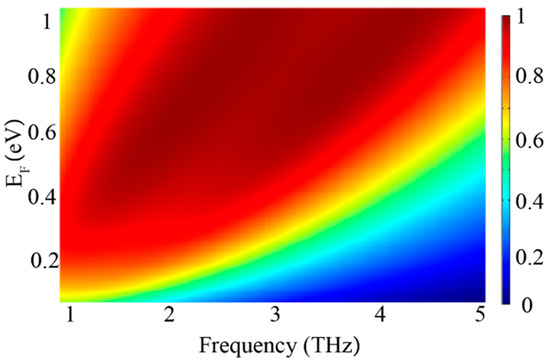 The calculated coherent absorption of the proposed design as a function of the operating frequency and Fermi level of graphene.