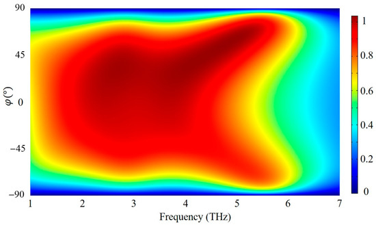 In practical applications, wide-angle absorption represents a crucial feature of absorbers. We investigated the impact of various incident angles on the absorption performance. Figure 7 illustrates the coherent absorption of the proposed asymmetric graphene metasurface as a function of the operating frequency and incident angle φ. Clearly, the absorption magnitude and bandwidth are well maintained until the incident angle increases to 45°, indicating that the absorption resonance is insensitive to small incident angles. When the incident angle reaches 60°, the absorption sharply decreases, implying weak coupling between the structure and the oblique incident waves.