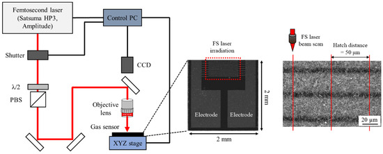 Schematic diagrams of laser system, gas sensor electrode, and FS laser-irradiation procedure.