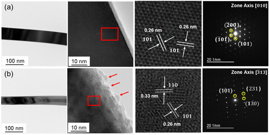 Figure 2 shows the qualitative XRD analysis of the pristine SnO2 NWs (Figure 2a) and laser-irradiated SnO2 NWs with different laser energy densities of 138 (Figure 2b) and 414 (Figure 2c) mJ/cm2. For each specimen, the XRD patterns were consistent with those of crystalline SnO2 (tetragonal rutile structure, JCPDS File No. 88-0287 [32]), and no additional peaks were observed. Figure 3a,b shows the TEM images of the pristine SnO2 NW and laser-irradiated SnO2 NW with a laser energy density of 138 mJ/cm2, respectively. High-resolution TEM images and selected area electron diffraction (SAED) patterns are shown in red boxes. For the pristine SnO2 NW, a smooth and flat nanowire surface was observed. Moreover, both the d-spacing and SAED pattern analyses verified the tetragonal rutile structure of the SnO2 NWs [33]. For the laser-irradiated SnO2 NW, the equivalent crystal structure was analyzed based on the d-spacing and SAED pattern, which indicated no crystal structure change after the FS laser irradiation. However, multiple FS laser irradiation-induced nano-sized bumps developed on the nanowire surface (denoted by red arrows). This embossing surface may create more adsorption sites for gas species, thus improving sensing performance.