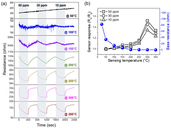 Figure 5a shows the transient resistance curves of the pristine gas sensor in the range of 50–350 °C for 10, 30, and 50 ppm of C7H8 gas, and the corresponding sensor response and base resistance are shown in Figure 5b. At 50 °C, no response was observed, whereas marginal resistance changes were indicated at 100 °C once the target gas supply was introduced and halted. The resistance decreased slightly as the target gas supply was introduced, which is characteristic of the gas-sensing behavior of n-type SMO gas sensors. As the temperature increases, more significant resistance changes and higher sensor responses were observed. Moreover, the optimum sensing performance was observed at 300 °C, where the sensor indicated a response level of 1.52 at 50 ppm of C7H8 gas. Meanwhile, the resistance change and sensor response observed at 350 °C were lower than those observed at 300 °C. No gas sensor response was indicated at low temperatures because the target gas molecules did not possess sufficient energy to overcome the adsorption barrier. At 300 °C, the desorption rate of the oxygen molecules and the absorption rate of the target molecules were equivalent, thus resulting in the optimum sensing performance. At 350 °C, the desorption rate exceeded the adsorption rate; therefore, a relatively weaker sensor response was achieved compared with that achieved at 300 °C. Thus, subsequent gas-sensing tests were performed at 300 °C.