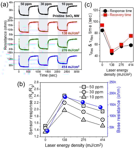 Figure 6a shows the dynamic resistance curves of the pristine SnO2 NWs and laser-irradiated SnO2 NWs with the laser energy densities of 138, 256, and 414 mJ/cm2 toward 10, 30, and 50 ppm of C7H8 gas. Figure 6b shows the corresponding sensor response and base resistance as a function of the laser energy density. The sensor response for the pristine SnO2 NWs was 1.52 at 50 ppm of C7H8 gas, whereas that for the laser-irradiated SnO2 NWs with a laser energy density of 138 mJ/cm2 was 2.42. The sensor response decreased as the laser energy density increased; interestingly, the sensor with higher base resistance values exhibited better sensor response toward C7H8 gas. Figure 6c shows the response and recovery times as a function of the laser energy density toward 50 ppm of C7H8 gas. The shortest response and recovery times were indicated by the laser-irradiated SnO2 NWs with a laser energy density of 138 mJ/cm2, which demonstrated the highest sensor response. This result verifies that the FS laser irradiation improves the gas-sensing performance, and laser parameters significantly affect the gas-sensing performance.