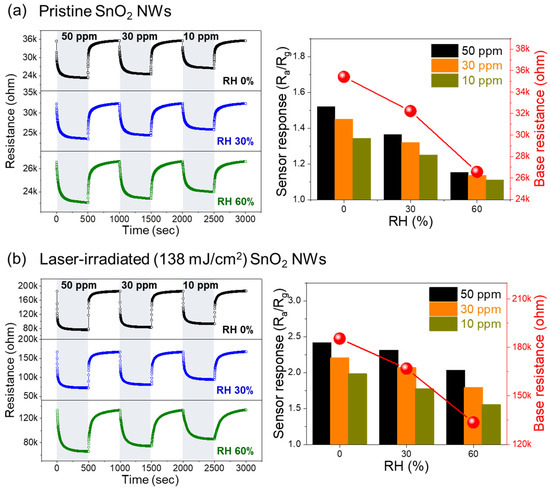 Gas-sensing tests were conducted at different RH values to examine the reliability of the SnO2 gas sensor. Figure 7 shows the dynamic resistance curves and the corresponding sensor response and base resistance for the pristine SnO2 NWs (Figure 7a) and laser-irradiated SnO2 NWs with a laser energy density of 138 mJ/cm2 (Figure 7b) toward 10, 30, and 50 ppm of C7H8 gas. Both gas sensors showed deteriorated sensing performance as the RH level increased. This is because water molecules may adhere to the adsorption sites of the SnO2 NWs, where the target gas should be adsorbed, thus deteriorating the sensing performance as the RH level increases [34].