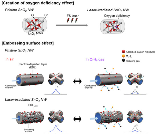 In this study, the SnO2 NWs were synthesized using the Au-catalyzed VLS method. Subsequently, the SnO2 NWs were irradiated with the FS laser at energy densities of 138, 276, and 414 mJ/cm2. Based on the results of the TEM analysis, the flat surface of the SnO2 NWs transformed into an embossing surface with multiple nano-sized bumps owing to the FS laser irradiation. Moreover, the result of EELS analysis revealed that the FS laser irradiation induced the formation of the SnO and SnOx phases in the SnO2 NWs. Subsequently, the gas-sensing behavior toward C7H8 gas as a reducing gas was examined. The gas-sensing performance of the FS laser-irradiated SnO2-NW gas sensor was superior to that of the pristine SnO2-NW gas sensor. Specifically, the FS laser-irradiated gas sensor with a laser energy density of 138 mJ/cm2 exhibited the highest gas response. The pristine SnO2 NWs showed a sensor response level of 1.52 at 50 ppm of C7H8 gas, whereas the laser-irradiated SnO2 NWs at 138 mJ/cm2 showed a sensor response level of 2.42. The sensing mechanism of the laser-irradiated gas sensor was attributed to the formation of an embossing surface and the generation of oxygen deficiency at the SnO2 NWs, which modulated the gas absorption sites and conduction channels, respectively. Moreover, the robustness of the laser-irradiated gas sensor was confirmed by verifying comparable gas-sensing behaviors between the fresh and 6-month-old gas sensors in different gas concentrations and RH levels.